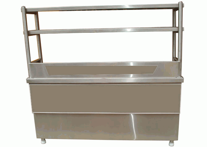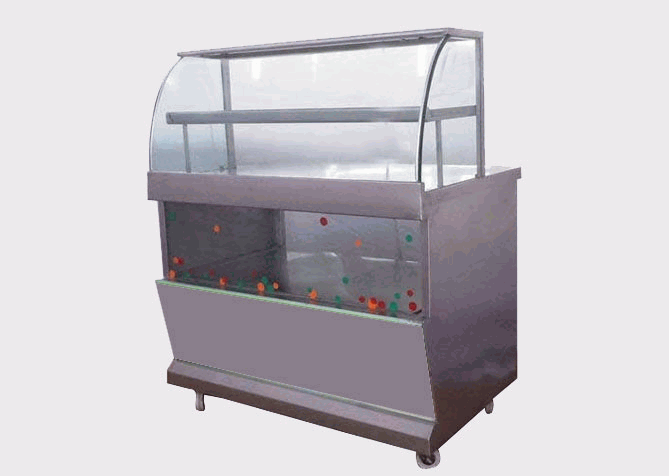 Suitable design for display and live counter for juicer with storage and display, made out of S.S. body with 12mm thick bend glass, kenopi also if require, in the working Top fitted bowl for requires.
