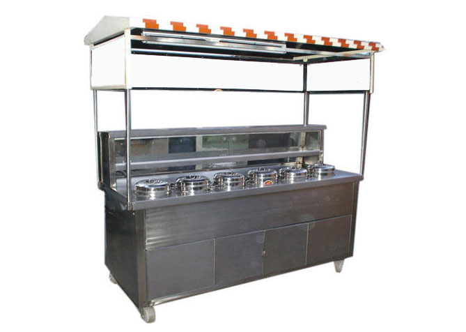 Suitable design for display and live counter for live pavbhaji made of body S.S. with 600mm diameter x 8mm thickness M.S. tawa with polished and including suitable LPG burner fitting and bowl for butter, masala.