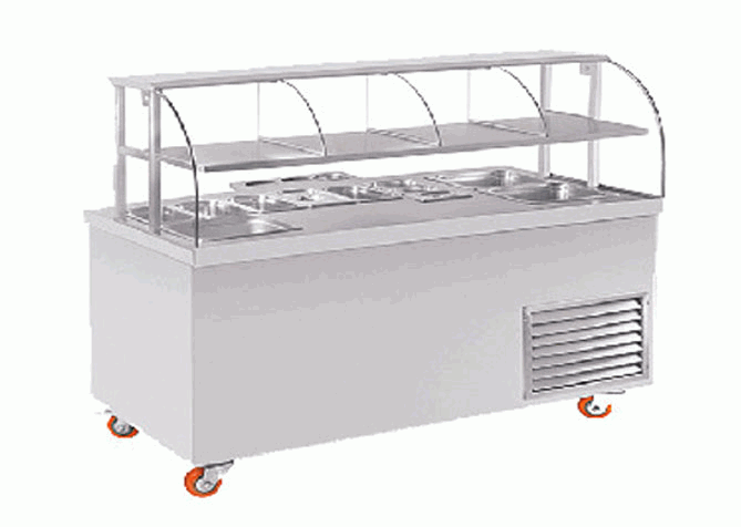 Suitable design for display and live counter for pani puri with storage and display made out of S.S. body with 12mm thick bend glass, kenopi also if require, in the working top fitted bowl for chatnies, topping, butter, etc. as per require.