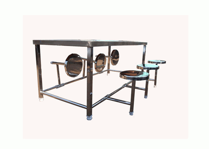 Suitable design of good quality and heavy duty dining table with chairs or without chairs for industrial canteens, mess and fast food outlets made of S.S. 38 mm dia. Tubes with stool top made of S.S. 16 gauge sheet and stool thali S.S. 20 guage sheet with support m.s. available stool fixed or movable with tables.